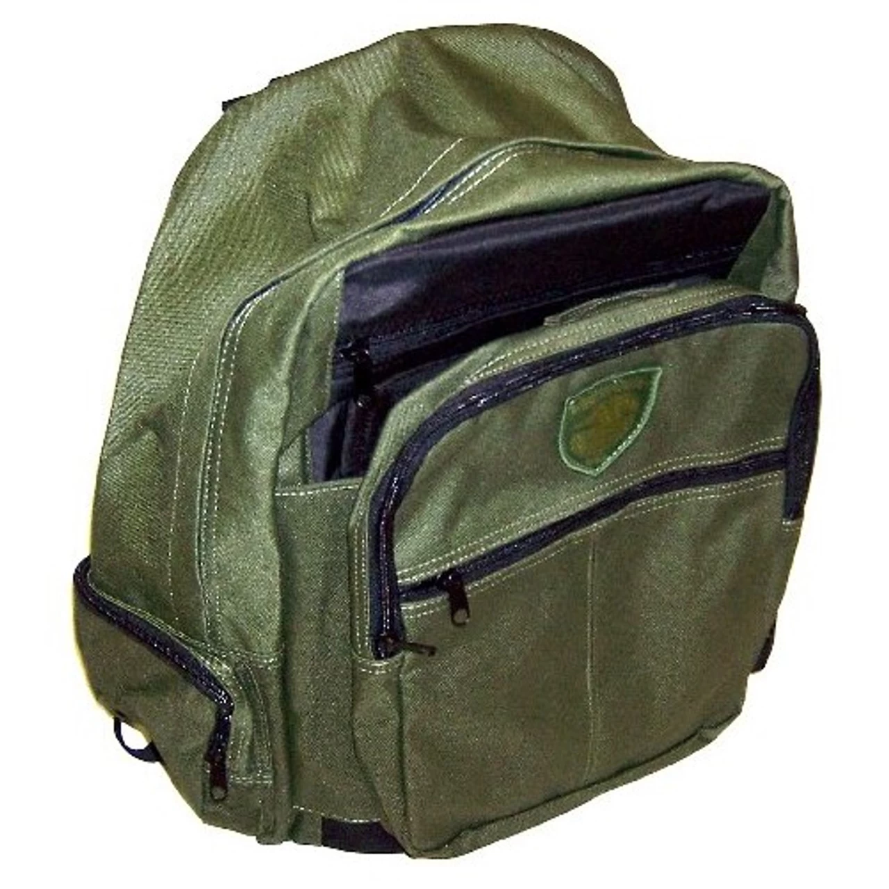 This is the Military Bag from Birdhouse. Green in Color. This Backpack has 1 Main storage compartment, and 3 other large storage compartments, and 2 small zip compartments on the sides. The bag measures 17″ H x 7″ D x 14″ W