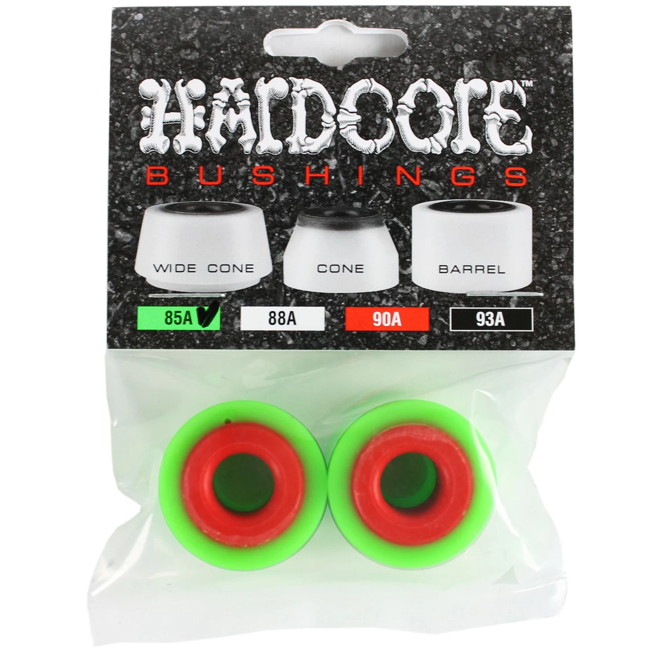 Hardcore Bushings feature the SkateOne patented bonded insert technology that will transform your trucks into high performance carving, racing, or freeride machines. The bonded insert will noticeably reduce slop, create a more fluid turn, add stability, and allow you to run a lower durometer bushing in your truck than normal. The insert locks your steering axis in without any extra parts and ensures you only compress the bushing top and bottom rather than open it like an elastic band. Zero break in. The bushing of choice for the Aera Trucks’ team including: Patrick Switzer, Byron Essert, Kevin Reimer Will fit ALL Longboard trucks that use standard bushings, or Tall bushing trucks when using a shim. Great for Aera, Paris, Caliber, Randal, etc.
