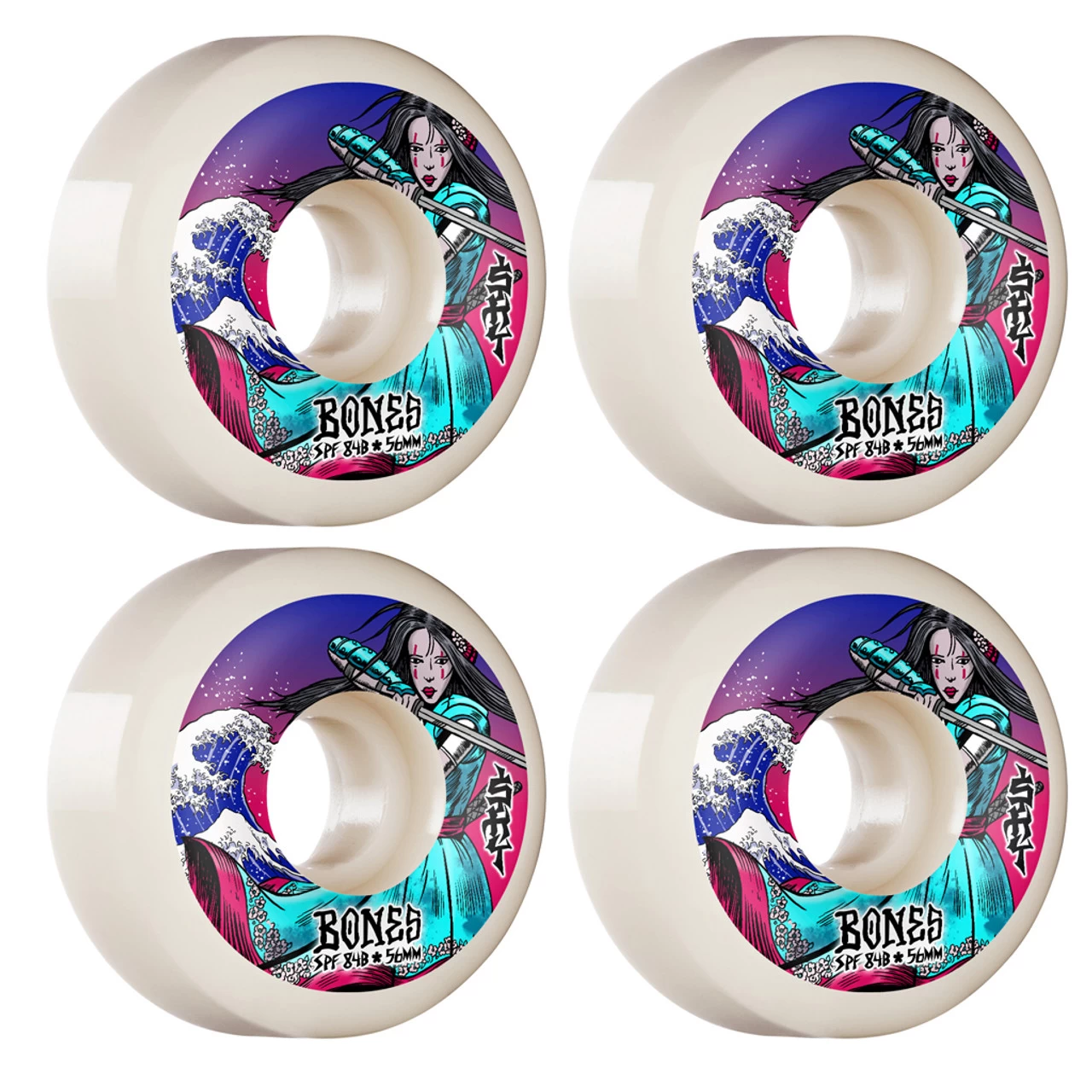 These wheels measure 56mm x 32mm With a hardness of 84B (104A). Skatepark Formula (SPF) is very high quality urethane specifically formulated to resist flatspotting on slick or smooth surfaces while maintaining a higher rebound for a quicker response and a faster roll. Skatepark Formula has a high resistance to abrasion while not compromising hardness and slide ability. Simply put, Skatepark Formula wheels grip better on slick surfaces, are almost impossible to flatspot, and are the fastest, longest lasting wheel on the market today.
