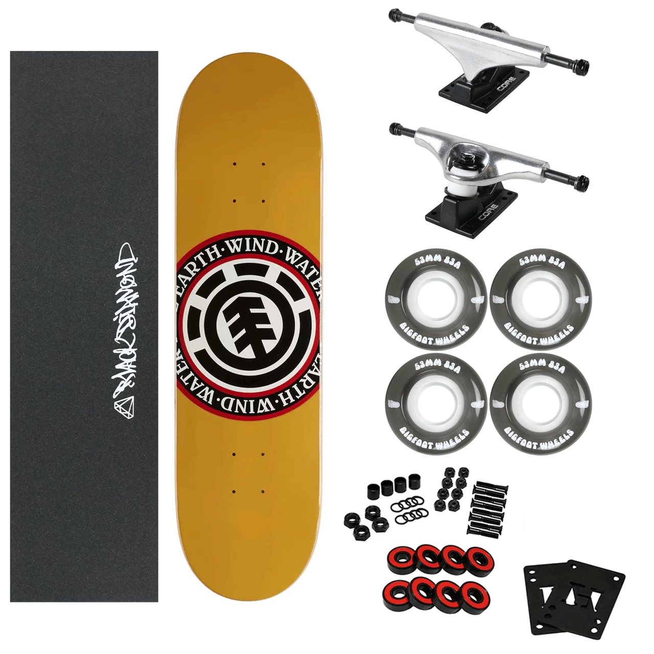 This skateboard features soft 83A wheels for an extra smooth ride. Includes the Element Seal Mustard Deck, Core trucks, Bigfoot 53mm Black 83A Wheels, Amp Speed Bearings, 1″ Hardware, and Black Diamond Griptape. Arrives un-assembled which allows for customization and a feeling of accomplishment. Skaters love building their boards! Easy to assemble!