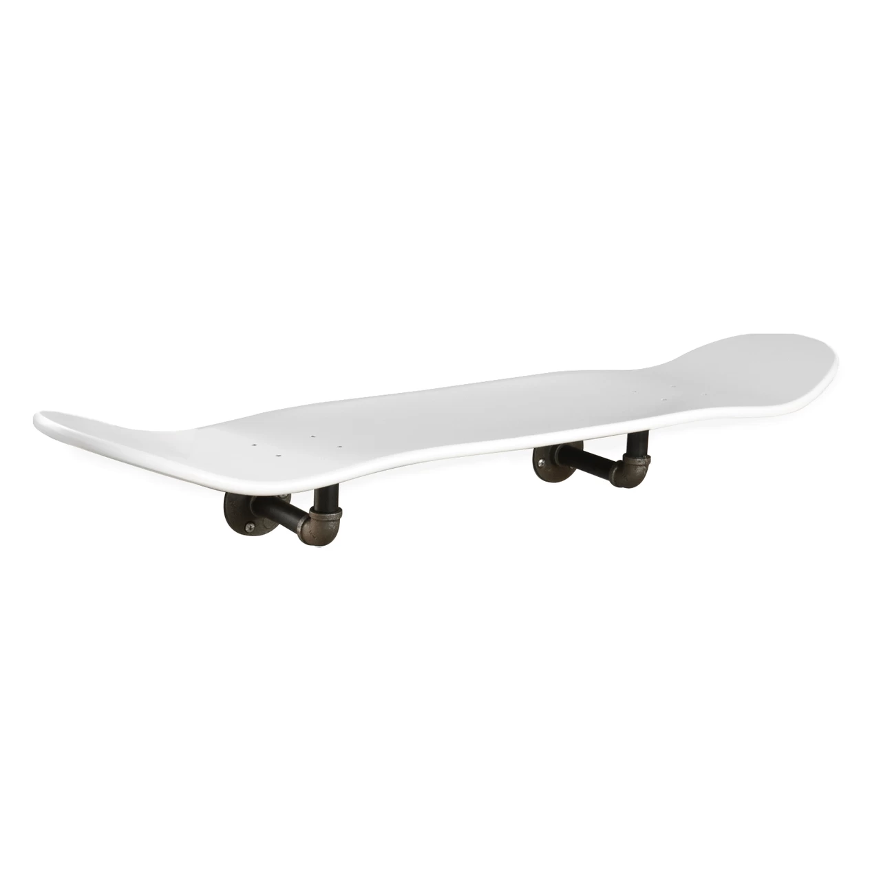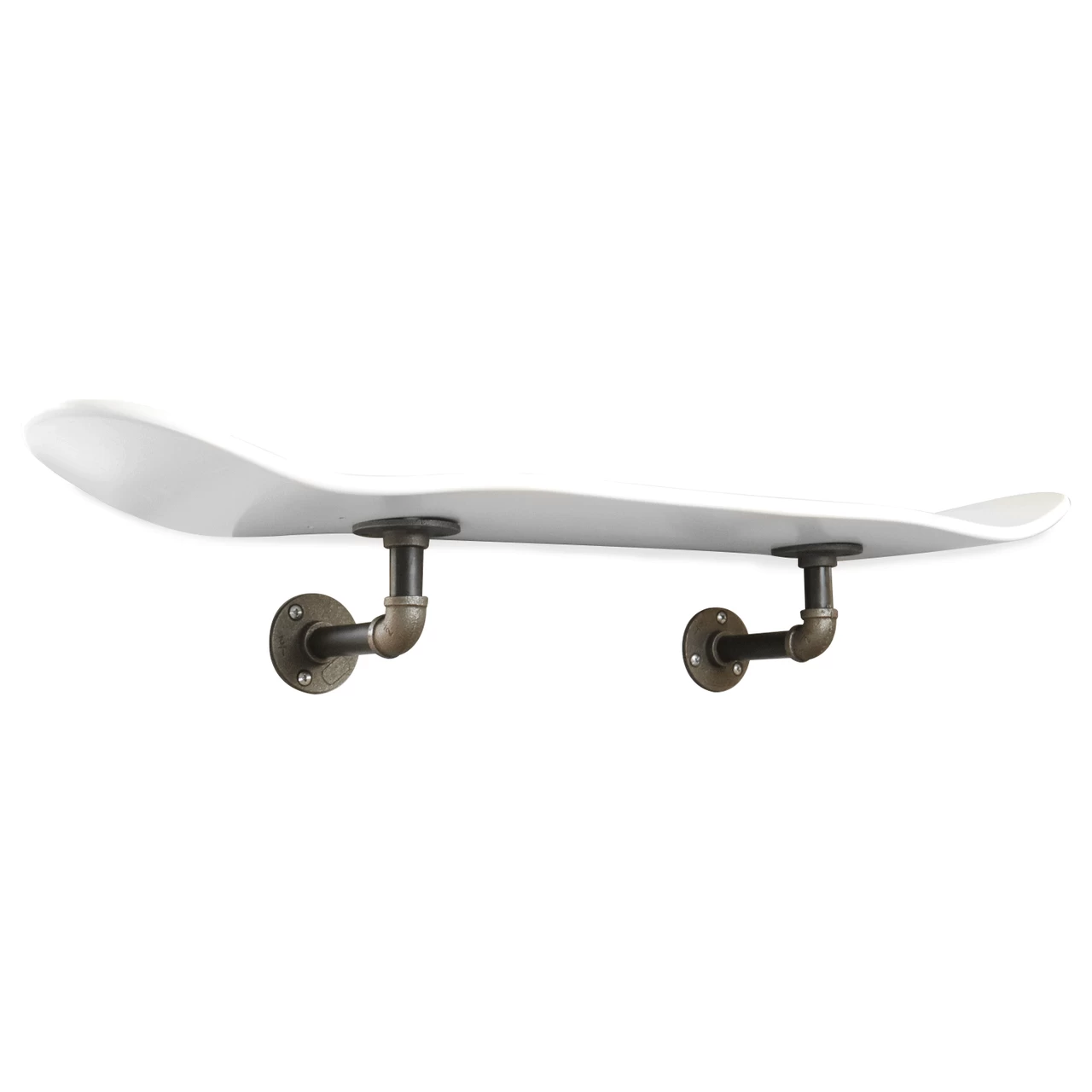 INCLUDES: 1 Maple 7.75″ Skateboard Deck, 4 Plumber Pipe Mounts (2 for deck, 2 for wall), 2 Elbows, 4 Pipes, 6 deck mounting screws, 6 wall mounting screws, and 6 drywall anchors. *Because this is a real skateboard deck, there are pre-drilled holes for trucks. These are not the same holes for the bracket mounts, which must be drilled separately.*