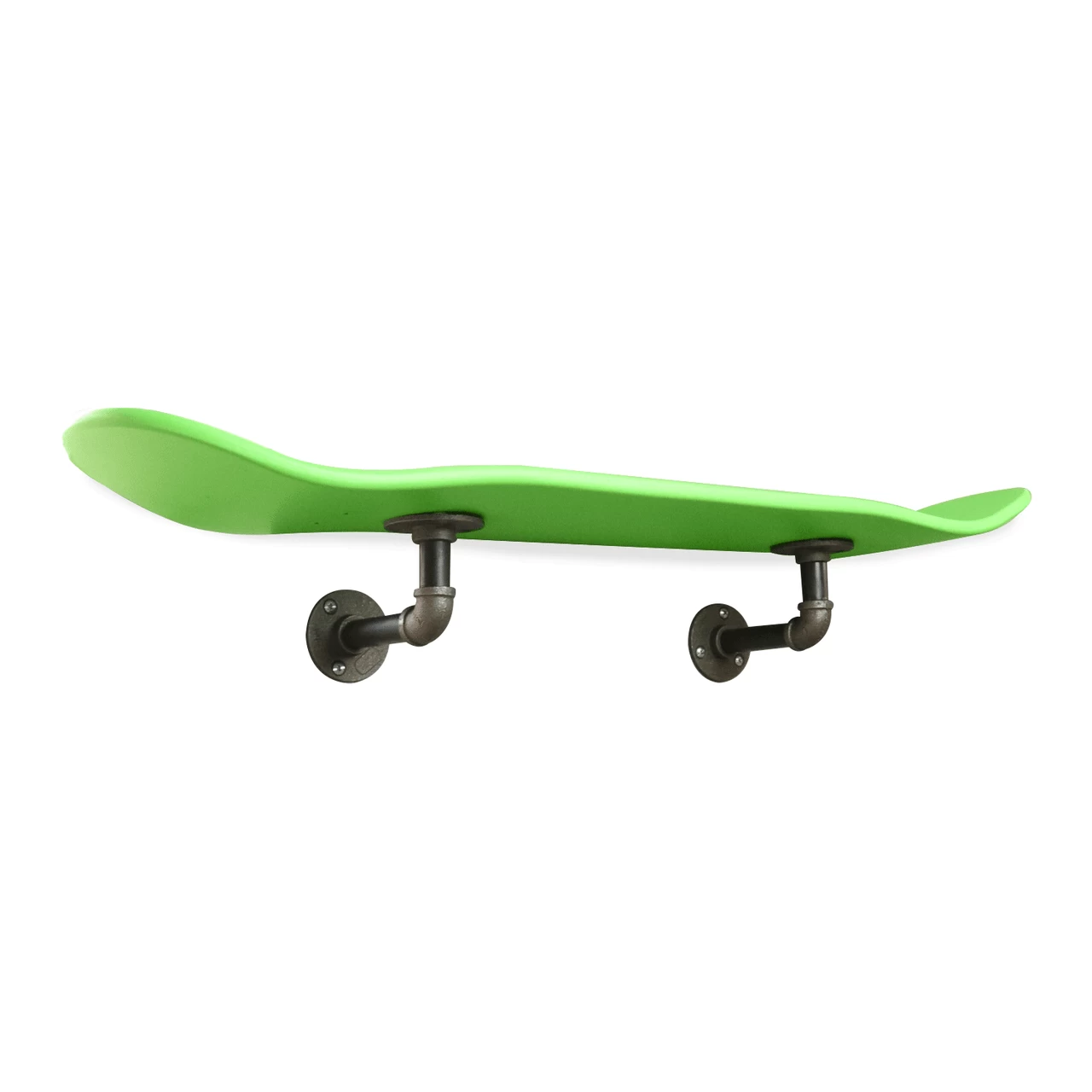 INCLUDES: 1 Maple 7.75″ Skateboard Deck, 4 Plumber Pipe Mounts (2 for deck, 2 for wall), 2 Elbows, 4 Pipes, 6 deck mounting screws, 6 wall mounting screws, and 6 drywall anchors. *Because this is a real skateboard deck, there are pre-drilled holes for trucks. These are not the same holes for the bracket mounts, which must be drilled separately.*