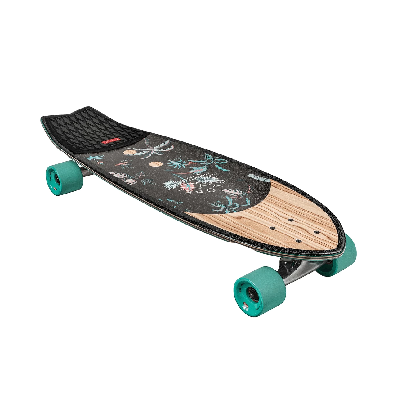 Surf-inspired swallow-tail cruiser. The Sun City in Olivewood/Neon Jungle features Resin-7 hard rock maple deck construction with mellow concave and kick tail. Also features 5.25” Tensor alloy trucks and 62mm 78a conical cruiser wheels for a smooth ride. Specs: 30″ x 9″ x 18.5″WB, Mellow concave with kick tail, 5.25″ Tensor Alloy trucks, Globe Abec-7 bearings, 62mm 78a Colonial Cruiser wheels.