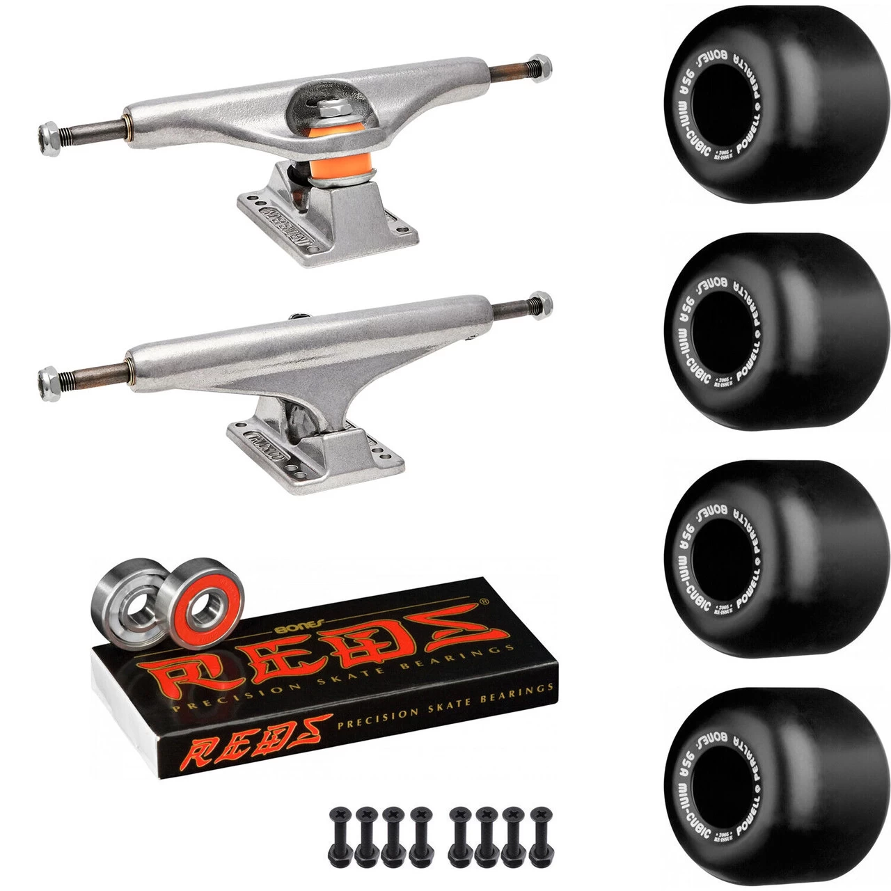 When you gotta tune up that old school board, make sure you do it right. This package includes Independent Stage 11 Trucks, Powell Peralta Mini-Cubic Wheels, Bones Reds Bearings, and Mounting Hardware. New Stage 11 standard height trucks are unquestionably the best combination of features and geometry Independent has ever produced. By improving the modern performance features and iconic look of the Stage 10 design with newly reworked geometry based on Independent Stages 5-7 Independent has created the new standard to which all other trucks will be judged. New Stage 11s feature improved performance features like Improved turning, Improved stability on landings and at high speeds-Less wheels bite, Better overall grind clearance, Improved No Hang-up yoke, Longer lasting, Stronger on impact. The mini-cubic skateboard wheels from Powell Peralta are a classic sensation. These wheels are great for completing that Old School board to take to the park or rip bowls & pools with. This is a great all around old school wheel. Measures 64mm x 57mm with a 95A hardness. Bones Reds Bearings feature Single, non-contact, removable rubber shield for easy cleaning and less friction, High speed Nylon ball retainer for greater strength and speed, Pre-lubricated with Speed Cream racing lubricant, Skate Rated, clearances, tolerances, materials and lubricant provide the best performance and durability possible.