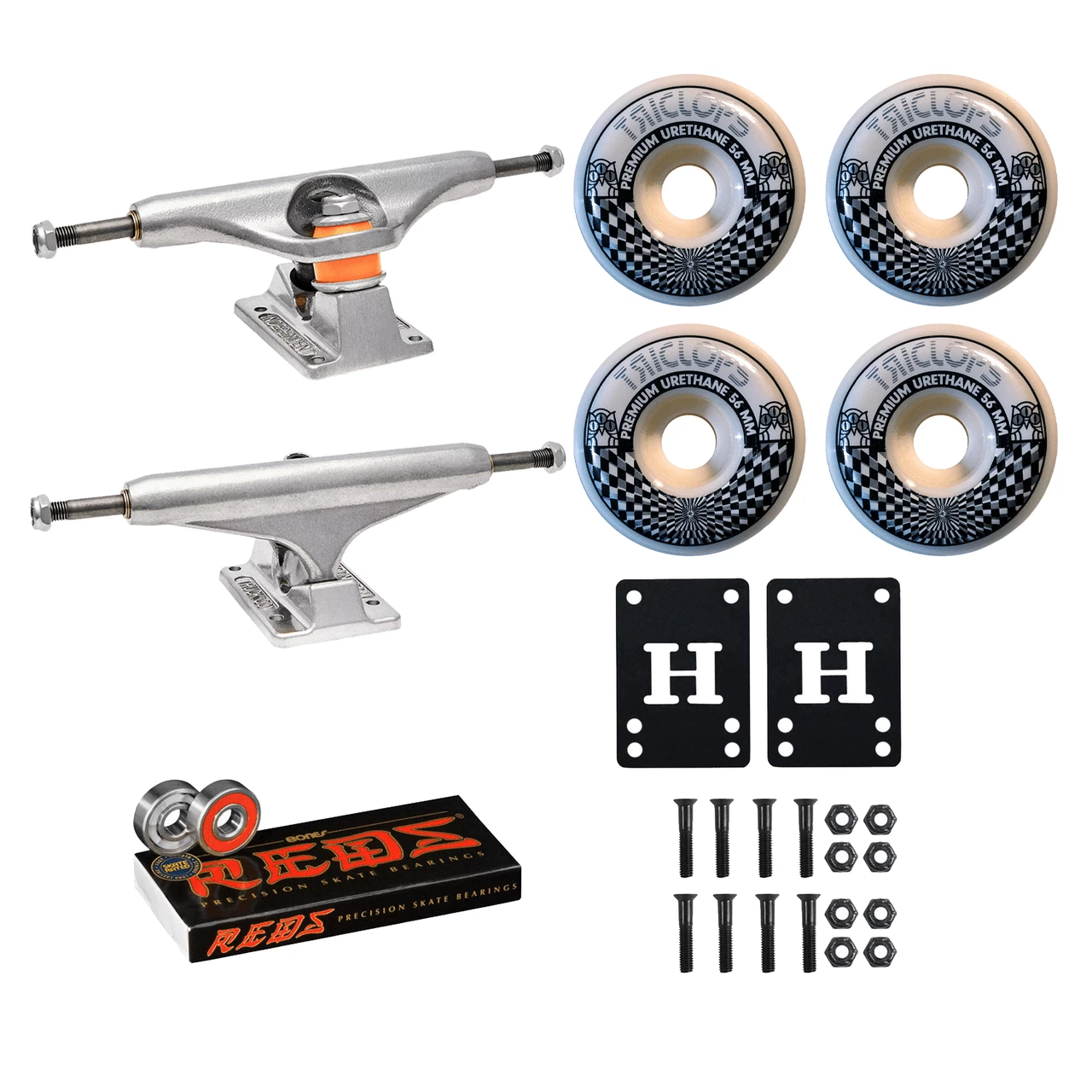 This Independent Trucks Kit feautres Stage 11 Raw Indy trucks, new Triclops Skateboard wheels, Bones Reds Bearings, 1/8″ Risers, and 1″ Black Hardware. Independent Stage 11 trucks are durable and high performing for all types of skating. Bones Reds bearings are the best and most popular priced bearing on the market. High quality mixed with low cost make these the go-to bearing for skaters worldwide.