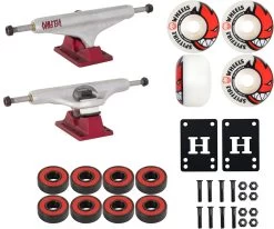 THE REST: This kit includes Amp Abec 5 Bearings, Bearing Spacers, 1″ Hardware, and 1/8″ Riser Pads (everything you need to make a complete skateboard except the deck/griptape).