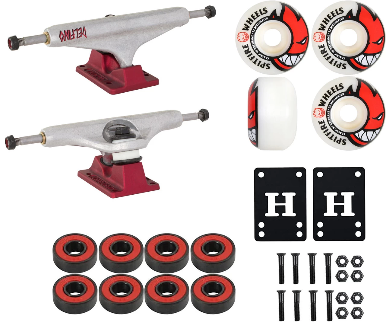 PACKAGE INCLUDES: Independent Pedro Delfino Signature Hollow Trucks, 52mm Spitfire Bighead 99A wheels, Amp Abec 5 Bearings, 1″ Hardware, and Risers.