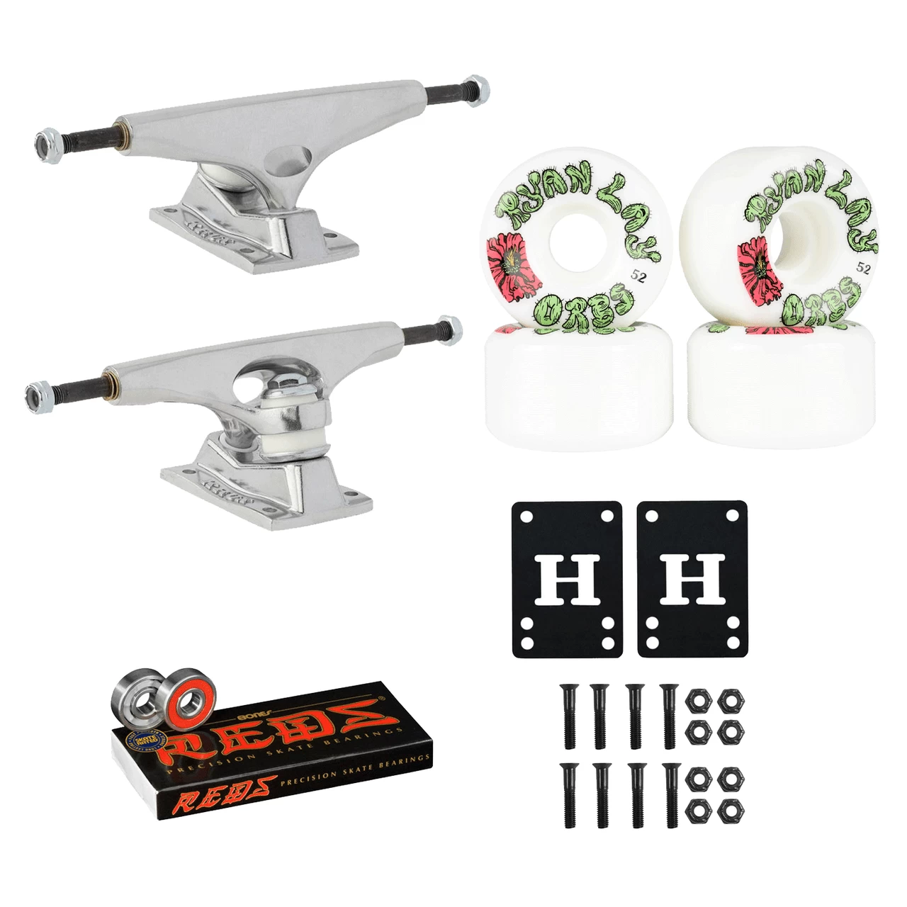 This premium upgrade package contains Krux K5 DLK Trucks, new Welcome skateboard wheels, Bones Reds bearings, 1/8″ black riser pads, and 1″ black phillips hardware. Krux K5 Down-low kingpin trucks feature the best grind clearance with improved strength and rigidity. Welcome wheels are perfect for rougher terrain with incredibly slidability. Bones Reds bearings are the best and most popular priced bearing on the market. High quality with low cost make these the go to bearings for skaters.