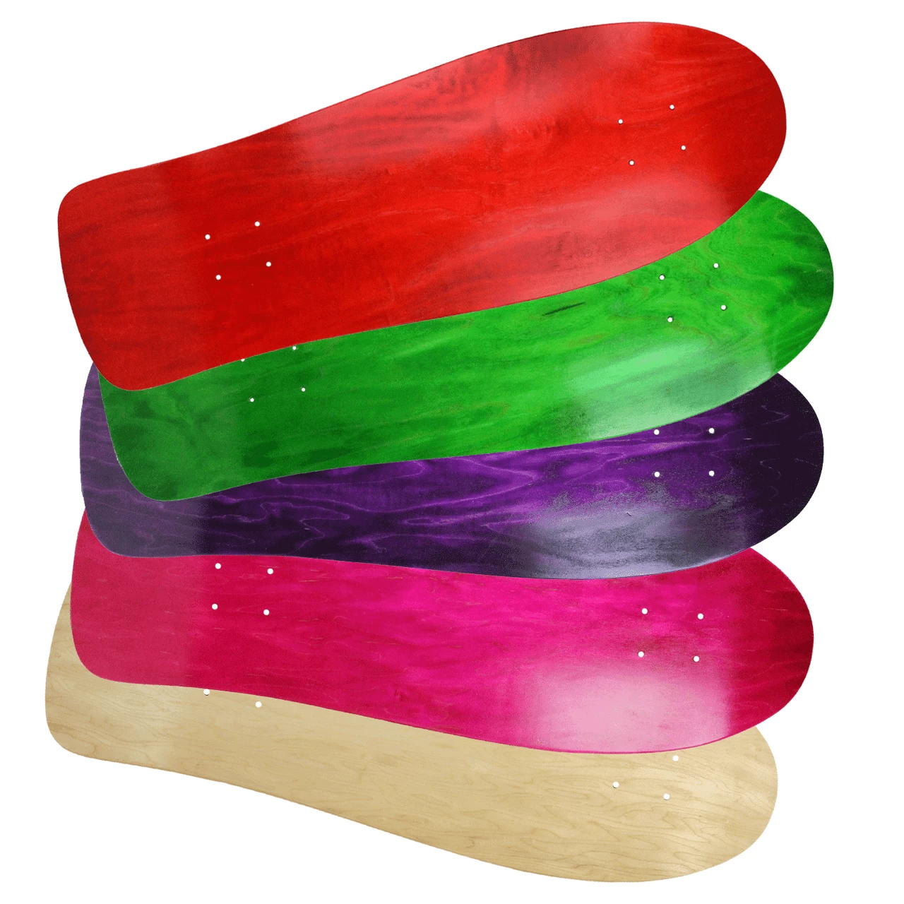 Buy in bulk and save. This old school shaped skateboard deck features the classic fish-style shape with a modern concave. This board features a large kicktail and also features a scooped nose. The holes are drilled with the new-school standard bolt pattern so you can mount any of your favorite trucks on this board. Blank boards are sweet for customizing, if you don’t want to ride it, you can paint it and hang it! Measures 10″ x 30″ with a 14.125″ wheelbase.This 5-Pack Includes 1 of each Natural, Stained Pink, Stained Purple, Stained Green, and Stained Red decks.