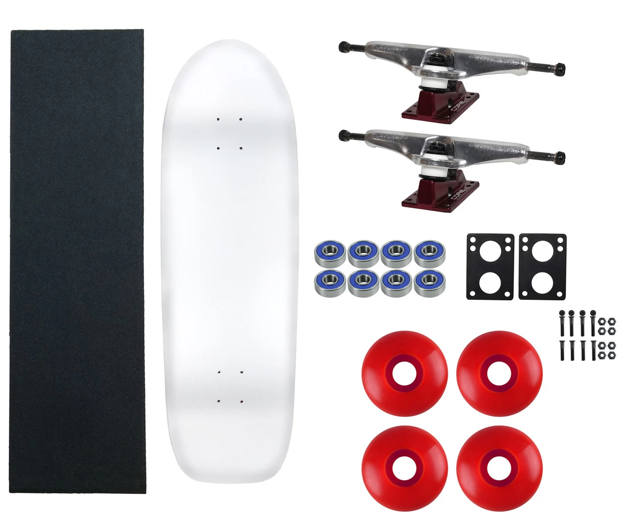 This complete old school skateboard package arrives unassembled so you can set it up however you want. The blank deck is perfect for customization! This package includes everything you need to build your skateboard including Core Hollow Trucks and 58mm Wheels. This old school skateboard deck features the full body shape with a modern concave, large kicktail, and a kicked nose. Measures 10” x 33” This board is made with 100% North American Maple. Core trucks feature hollow body kingpins, lightweight aluminum alloy hangers, heavy duty baseplates, and premium USA Made Bushings and Pivot Cups. Super high rebound (SHR) bushings and pivot cups offer a responsive, smooth, and consistent ride. 58mm 97A wheels are perfect for both street and park riding. Also includes precision bearings, 6mm riser pads, 1.25″ hardware, and a sheet of 10″ x 34″ Black Diamond Griptape.