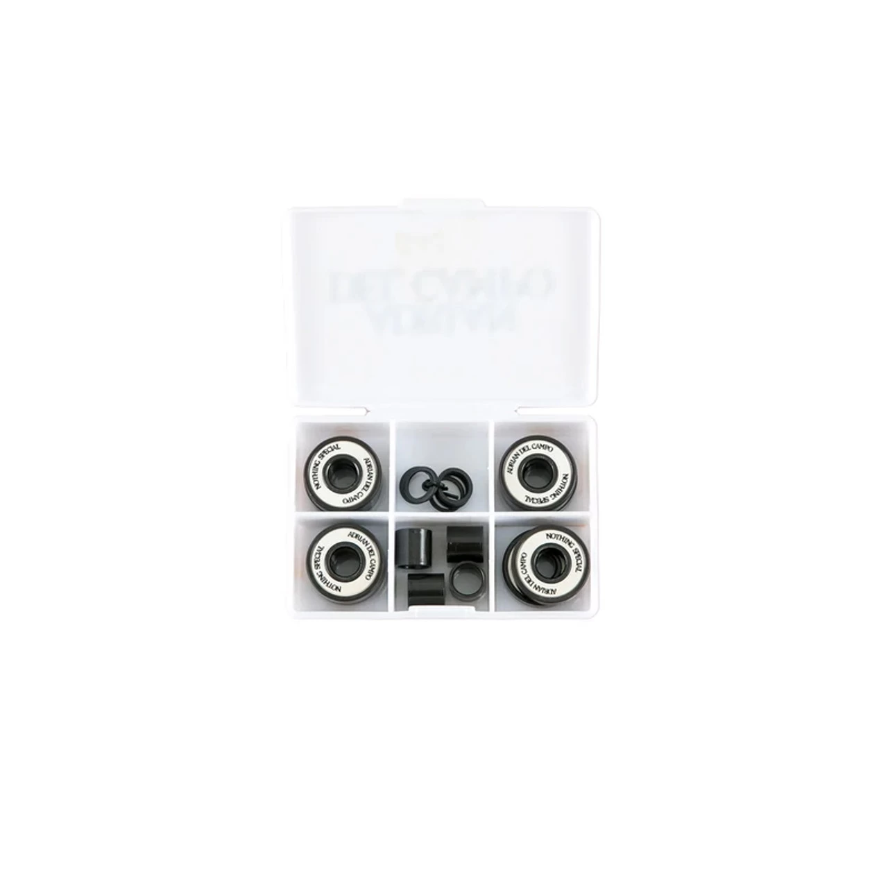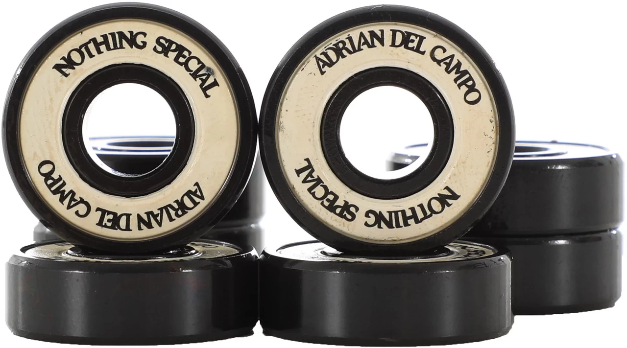 Adrian Del Campo Signature bearings from Nothing Special. These signature bearings maximize speed, longevity and durability. Bearing spacers and washers are included to further your bearings top end speed as well as reduce overall friction while riding. Nothing Special bearings come in a case so you can store the when you are not using them.