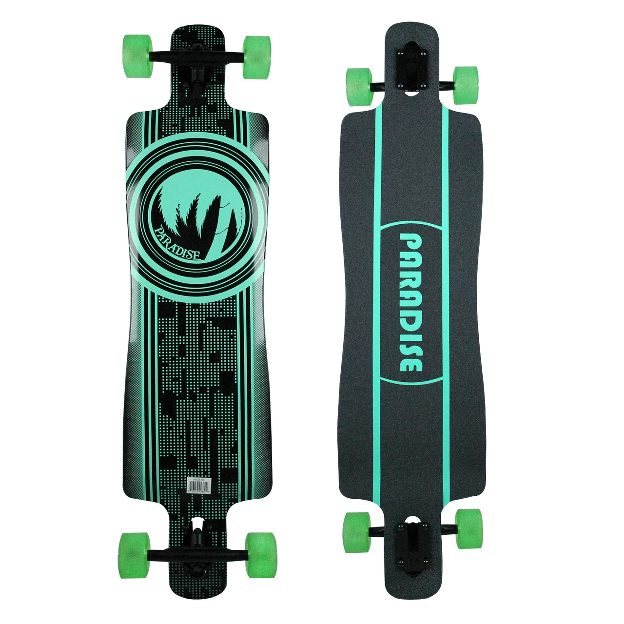 This is a brand new Freeriding shape from Paradise. Comprised of 10 ply’s of Canadian maple, the deck features concave and measures 10″ x 40″. This freeride longboard shape is aimed to please, concave where you need it most and nice, comfortable foot placement areas. Perfect for downhill speed and freestyle riding. This new formula was chosen based on rider feedback, the 80A hardness and 45mm wide footprint make the Bigfoot perfect for smooth as silk riding without sacrificing speed. Poured with the latest 80a SHR formula. Featuring a stone-ground contact patch with a center-set clear hub & acute angled lips. The board is complete with high-grade, strong aluminum alloy trucks, high rebound bigfoot wheels, Abec-7 Speed Bearings, Hardware, Risers.