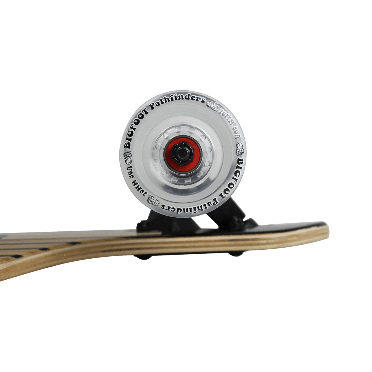Here we have a hybrid shape, combining the drop through with the pintail, Canadian Maple with Bamboo. The deck features a slight concave and measures 9.5″ x 44″. This is probably the most popular method of lowering the center of gravity on a longboard. The Drop Through shapes have high stability while retaining much of the responsiveness of a topmount. These boards have incredible traction, speed, and slide ability. The added length of the model also makes it easier and more comfortable to ride. The Bigfoot Stone-Ground Pathfinders offer a newly modified super high rebound formula and shape. This new shape was chosen based on rider feedback, and is the first wheel in the Bigfoot line to offer a stone-ground finish. The 83a hardness and 45mm wide footprint make the pathfinders perfect for the rider looking for a nice sized wheel that will perform at speed and slide right off the bat. The board is complete with high-grade, strong aluminum alloy trucks, high rebound bigfoot wheels, Abec-7 Speed Bearings, Hardware, & Risers. Board Specifics:. Size: 9.5″ x 44″. Type: Dropthrough Pin. Graphic: Tiki Face 2.0. Construction: Bamboo / Canadian Maple. Trucks: 180mm Downhill. Bigfoot Wheels: Pathfinders 70mm 80A. Grip: Black W/ Diecut Logo