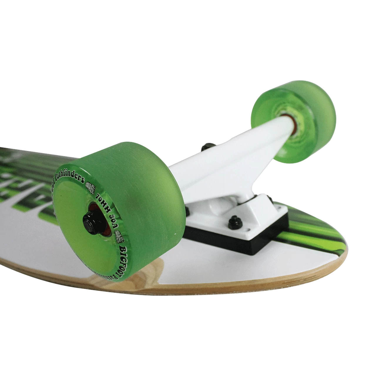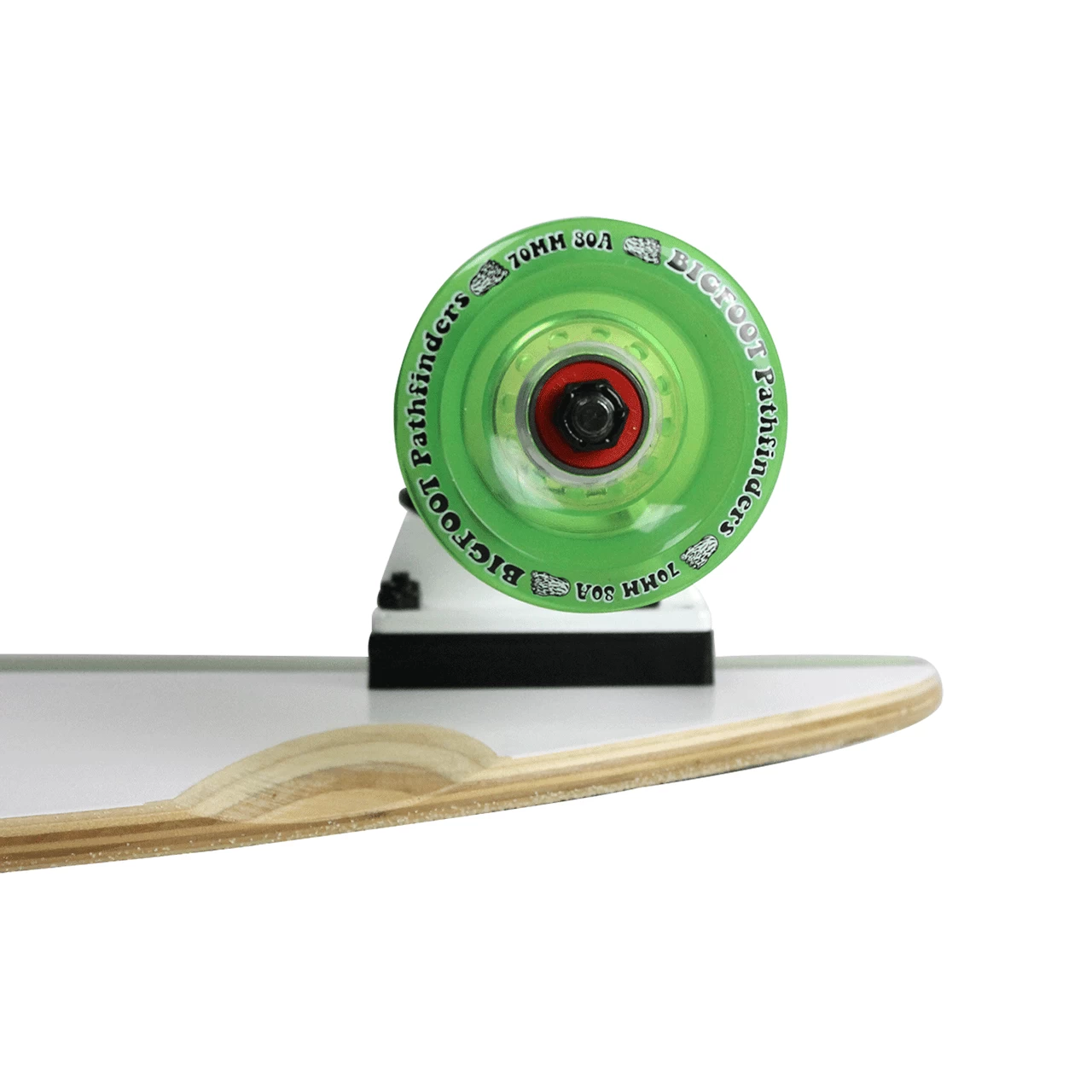 Paradise is stepping up again with the latest run of longboards which include top and bottom graphics! Comprised of a special bamboo / canadian maple construction, the deck measures 9.75″ x 41″ with a 28.25″ wheelbase. A clear-coat spray grit has been added to the top of the longboard to keep it looking fresh at all times. The board’s top layer is made of a beautiful bamboo inlay followed by 6 ply’s of hard rock candian maple. This is a strong board made for carving, cruising, sliding, and chillin. The Bigfoot wheels offer a newly modified super high rebound formula. This is one of the easiest longboards to maintain stabilty and stay in control. This new formula was chosen based on rider feedback, the 80A hardness and 45mm wide footprint make the Bigfoot perfect for smooth as silk riding without sacrificing speed. Poured with the latest 80a SHR formula. Featuring a stone-ground contact patch with a center-set clear hub & acute angled lips. The board is complete with high-grade, strong aluminum alloy trucks, high rebound bigfoot wheels, Abec-7 Speed Bearings, Hardware, and Risers. Board Specifics: Deck: Paradise Stalks. Griptape: Clear grit. Construction: Bamboo Inlay/Canadian Maple. Type: Pintail Bomber Shape, Concave. Size: 9.75″ x 41″. Trucks: 7.0 White Aluminum. Wheels: Bigfoot 70mm 80A Pathfinders. Bearings: Speed Abec 7.