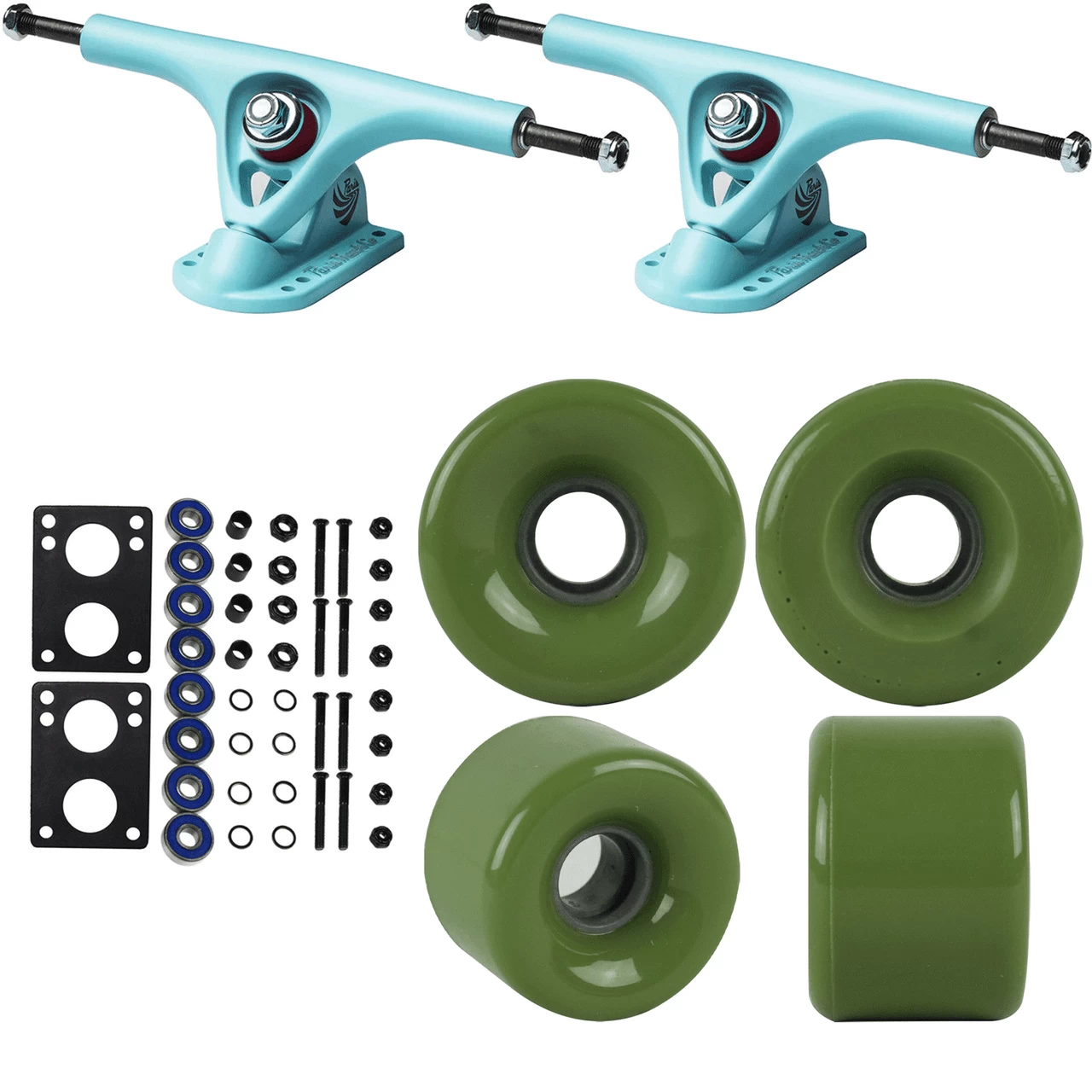 This longboard package contains everything you need to upgrade your set up, or build a new one. Paris V2 180mm Blue Trucks, Blank 64mm Military Green Wheels, Abec 7 Bearings, 1.5″ Hardware, and 6mm Risers are included with this “Just add wood” package.