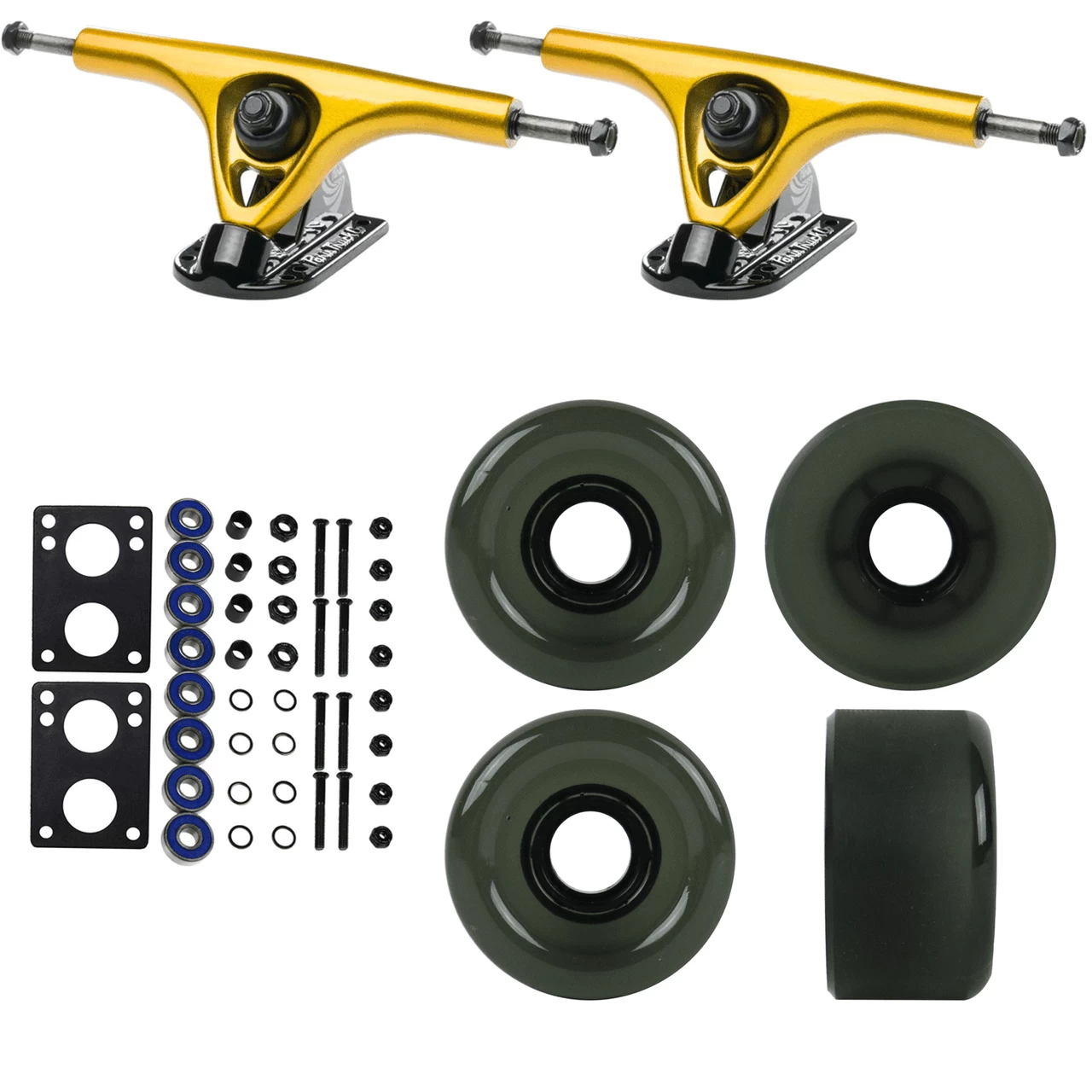 This longboard package contains everything you need to upgrade your set up, or build a new one. Paris V2 180mm Gold Trucks, Blank 65mm Smoke Black Wheels, Abec 7 Bearings, 1.5″ Hardware, and 6mm Risers are included with this “Just add wood” package.