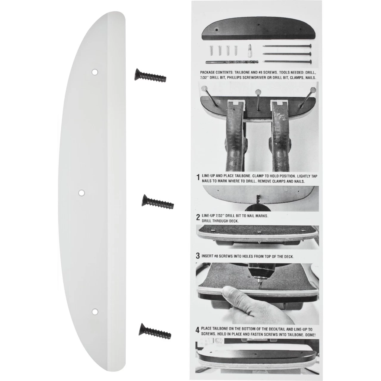 Based on original classic 8″ shape. 3- #8 machine screws Instructions *Does not include Rat Nuts. The drilled holes in the Tailbone are sized as pilot holes, just big enough to allow the screw to go in but small enough to give good grip on the threads. The user drilled holes in the deck are sized as through holes, these are big enough to allow the screw to fit easily in the hole and allow the head to snug up nicely to the surface of the deck when tightened. It is important that these user drilled through holes in the deck are the correct size.