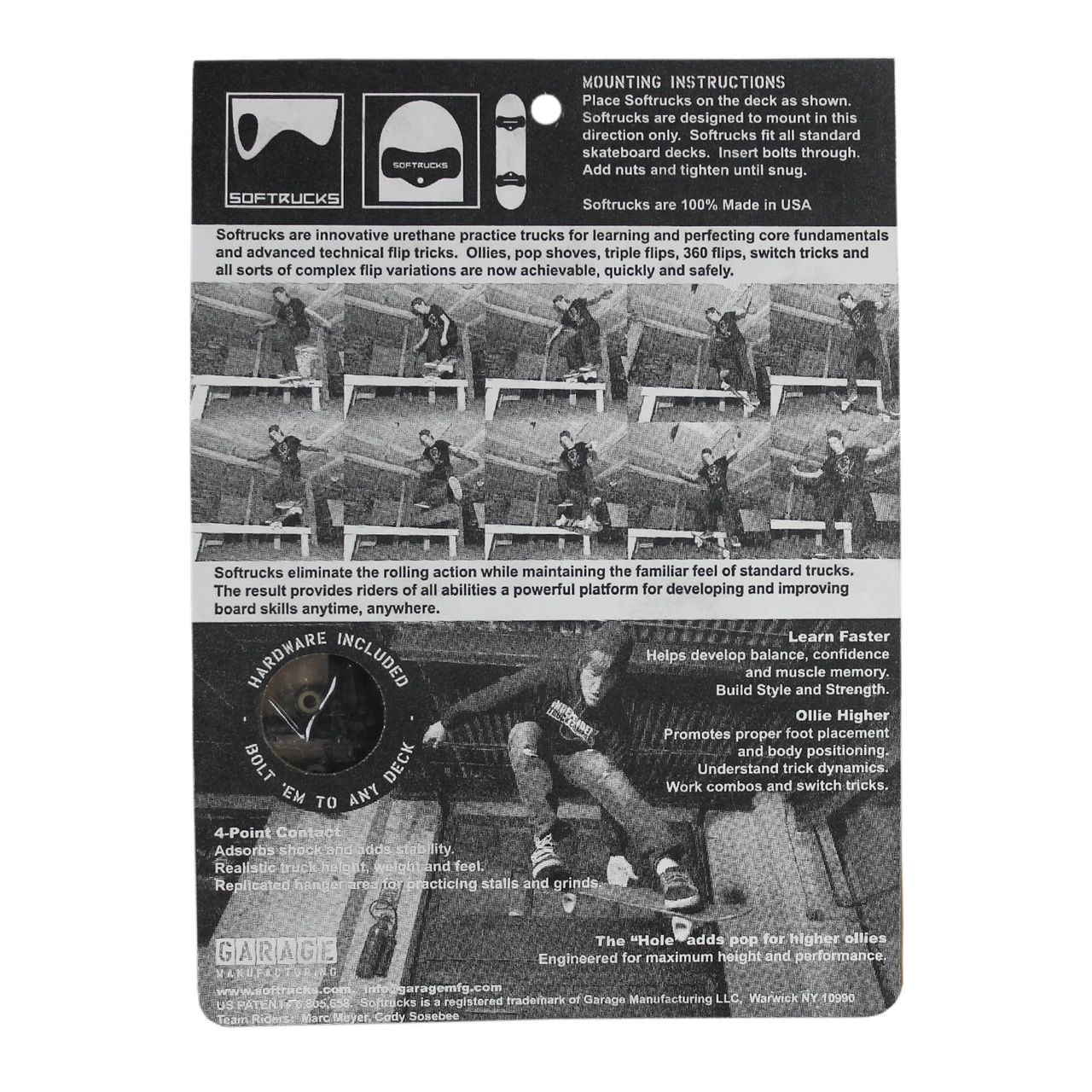 Softrucks are great for any skater of any level. These are made of super thick, and durable TPU Urethane. Made proudly in the USA. The reason they work, and we strongly promote them is simple. These are the same height of a normal skateboard, but without the Wheel. The rubber flexes side to side with a very similar feel that you get from normal trucks. Without Wheel on your skateboard it stays in place, and doesn’t shoot out from under your feet. This allows you to practice indoors without your board flying across the room and into the wall. Adds Pop for Higher Ollies. Build Skill, Strength, and Confidence. (develop proper footing, and balance). Practice All Kinds of Tricks. (Ollies, Kickflips, Stalls, Shuvits, and flips). 4-Point Contact. (absorbs shock, and adds stability). Includes Mounting Hardware.