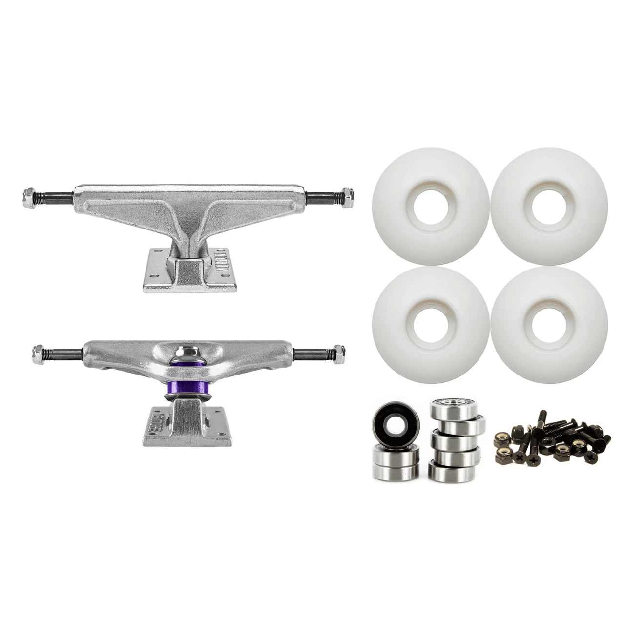 This package includes Venture Trucks, 52mm 99a White Wheels, Bullseye Abec 5 Bearings, and 1″ Hardware.